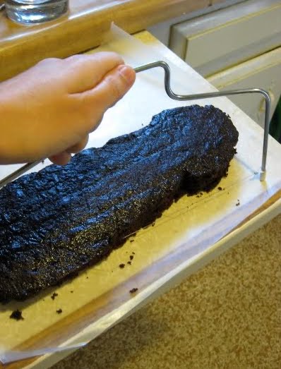 OK, back to the cake. First things first- gotta split the bottom layer in two. Look at my handy little contraption. I not only carve, I slice. Watch out boys!