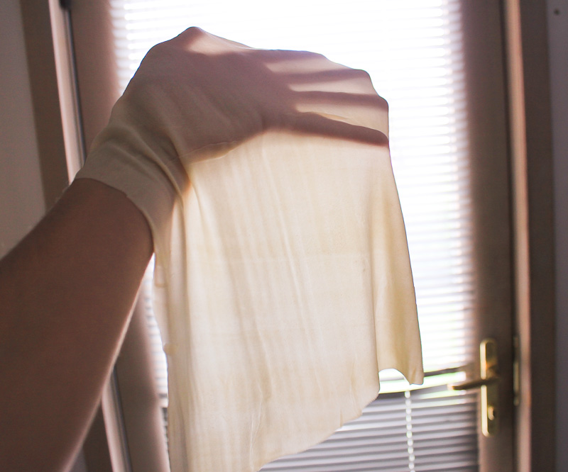 4. When you get it as thin as you can with the rolling pin, I switched over to the wooden dowel to really stretch it out. NOTE: you will not get it as thin as the frozen phyllo dough you purchase at the store, it is made by machine